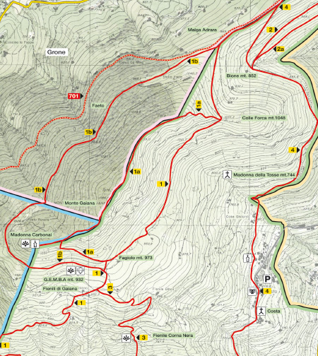 Arrivato al passo troverai nuove indicazioni. La prima ti porterà in pochi minuti alla Santella della Madonna dei Carbonai da dove lo sguardo potrà vagare sulla Pianura Padana, e nei suoi giorni più limpidi, guardando verso ovest potrai vedere il massiccio del Monte Rosa. Ritornato al passo Scaletta e seguendo l’altra indicazione comincerai a risalire la cresta tra rocce e bosco verso le antenne di trasmissione. Subito dopo giungerai al punto più alto del monte Gaiana (m. 1192) da dove puoi osservare la valle del Guerna e il monte Bronzone (m. 1334) e sullo sfondo il monte Guglielmo (m. 1957). Sul lato nord del sentiero, delle corde metalliche delimitano una voragine denominata “Laga”. Scendendo nel bosco troverai alla tua destra alberi di carpino nero, nocciolo, frassino e qualche roverella, mentre a sinistra grazie al terreno più umido perché rivolto a nord troverai maestosi faggi, ciliegi, aceri.