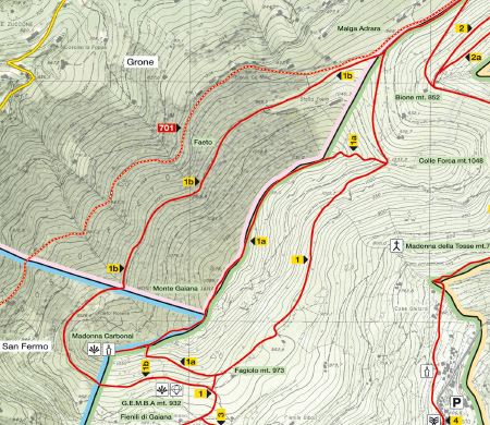 Nei pressi della chiesetta di San Fermo prendi il sentiero n°1 che scende dolcemente fino a giungere alla biforcazione con l’1b. Tra due muretti in pietra su un sentiero pianeggiante segui il segnavia 1b. Alzando lo sguardo alla tua sinistra noterai un ampio cascinale (cascina Faeto), mentre guardando a valle osserverai il monte di Grone con la frazione S. Antonio, alle spalle lascerai i bei Colli di San Fermo. Al termine del sentiero si apre una strada sterrata tracciata dai boscaioli per il trasporto della legna. La strada prosegue attraversando un bosco di faggi, frassini, ciliegi selvatici di alto fusto: sei in località Faeto. Giunto al termine della strada sterrata prosegui sul sentiero, incontrerai una cascina diroccata (casina del Faeto). Buttando lo sguardo a valle scorgerai la valle Cavallina con i paesi di Berzo San Fermo e Grone, in lontananza il monte Misma (m. 1160). Continuando la tua camminata giungerai nei pressi di un capanno di caccia dove comincerai a intravedere le cascine dei fienili di Gaiana. Dovrai continuare fino a raggiungere il segnale del sentiero n°1. Ancora pochi passi e sarai arrivato alla località Fagiolo dove il tuo sguardo potrà vagare dal monte Bronzone all’ampia Pianura Padana, e se le condizioni atmosferiche te lo permetteranno, osserverai anche gli Appennini. Se segui la segnaletica n°1 attraverso il bosco arriverai al colle Forca. Di fronte a te i Colli di San Fermo che potrai raggiungere con una comoda camminata.