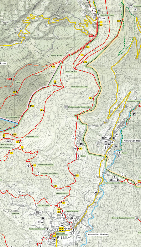 La descrizione del sentiero n°4 fino alla contrada Pennini è uguale a quella del sentiero n°3. Subito dopo aver superato la contrada Pennini, seguendo la strada in salita, in prossimità di un piccolo bacino idrico incrocerai i segnali dei sentieri n°3 e n°4. Seguendo le indicazioni, su strada pianeggiante, oltrepasserai una piccola piantagione di pino rosso e un bosco di castagni e carpini. In leggera salita giungerai nella frazione Costa (m. 604 ) dove ti consigliamo una visita alla chiesetta della Beata Vergine. Poco dopo la chiesetta, sulla tua sinistra, una vecchia fontana ti invita a dissetarti con la sua fresca acqua. Mentre prosegui su strada pianeggiante puoi ammirare alla tua destra il monte Bronzone e i colli Dine. Arrivato nel parcheggio, a sinistra l’indicazione del sentiero n°4 ti invita ad incamminarti sulla mulattiera che salendo ti porterà alla frazione Ghilardi. Questa mulattiera nel tempo passato era l’unica strada che collegava i colli di San Fermo con i paesi del Sebino. Con un caratteristico percorso nel bosco giungerai alla chiesetta della Madonna della Tosse da dove potrai ammirare uno scorcio sulla valle di Adrara. Poco dopo oltrepasserai una croce in legno chiamata “croce dei morti in Valle”. La mulattiera prosegue con un percorso poco impegnativo fino a giungere in località Bione. Qui, a destra, incontriamo la diramazione per i sentieri n° 2 e n° 2a. Salendo lungo la scalinata in ciottoli (“Risòl” datato 1889) giungerai sul colle dove incontrerai il sentiero n°1 che ti porterà alla chiesa dei S. Fermo e Rustico dei colli di San Fermo.